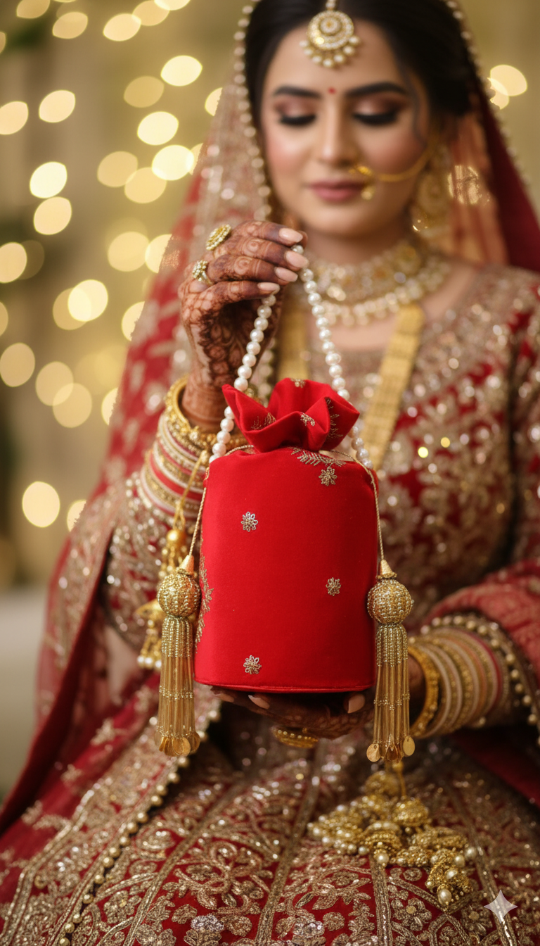 Luxury Red Bridal Potli Bag with Pearl Handle & Gold